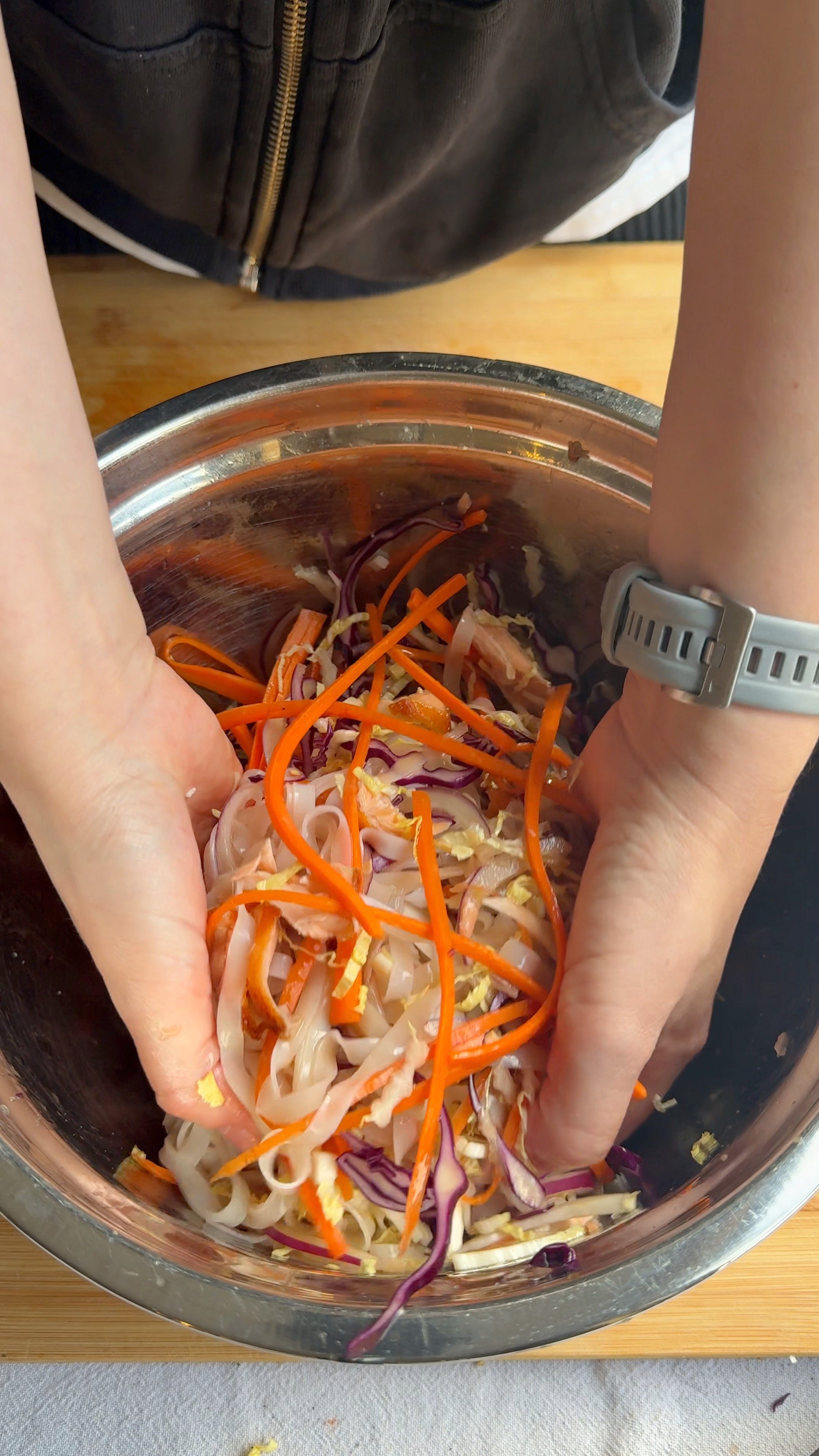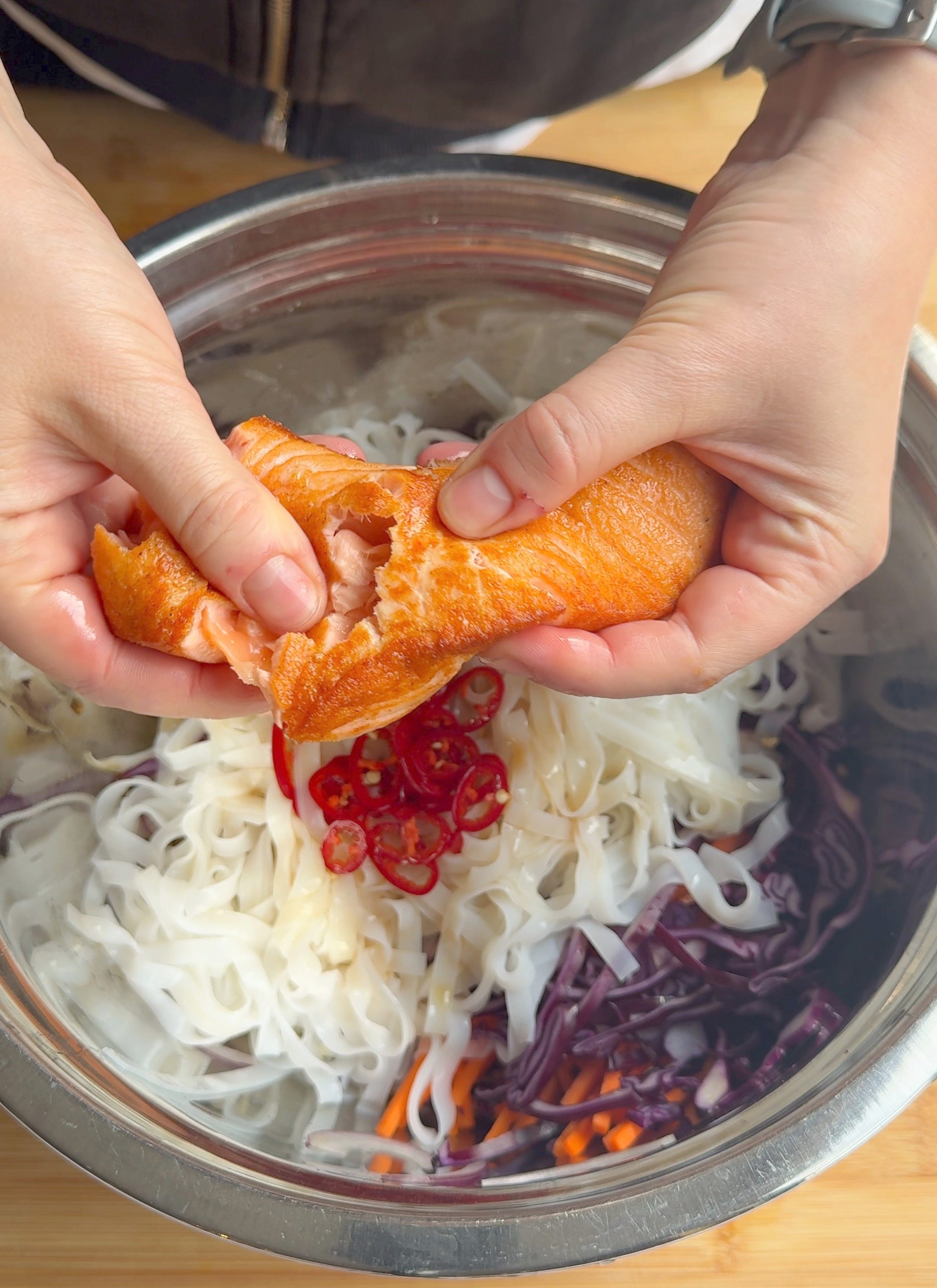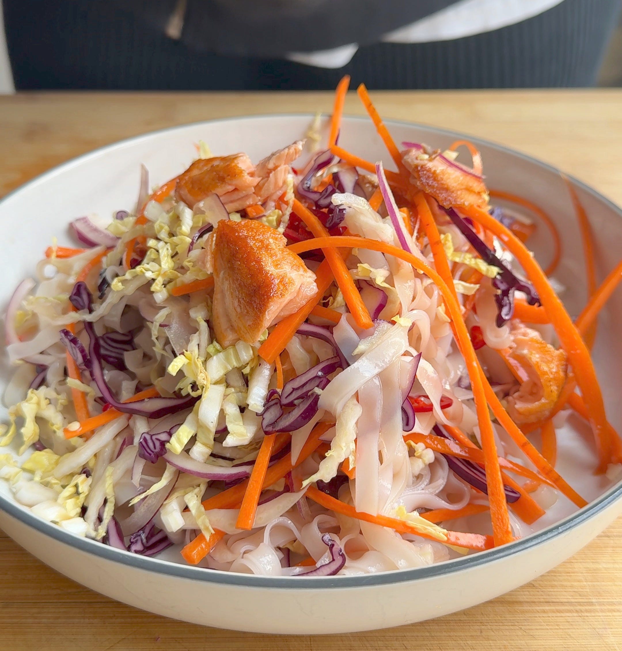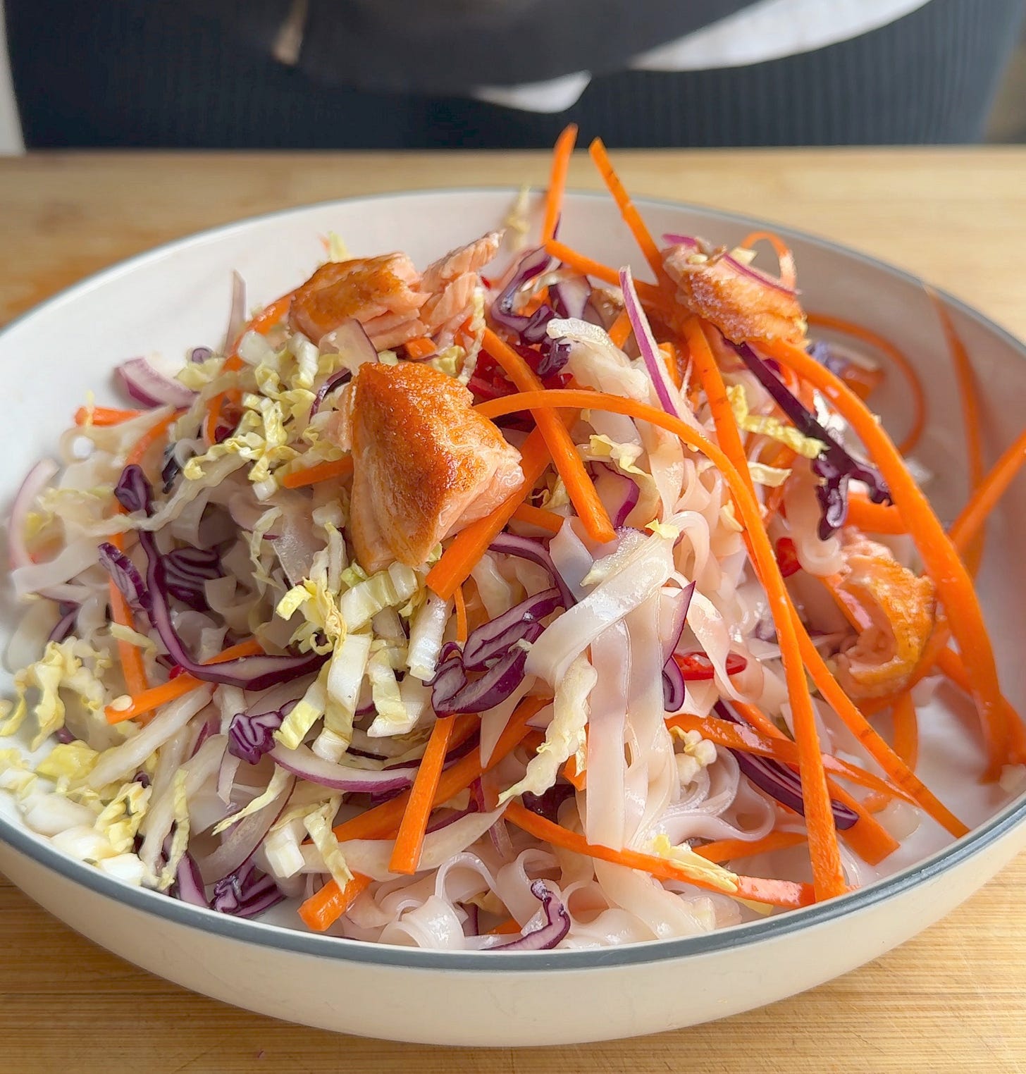 In a large salad bowl, add the shredded veggies, the noodles, the dressing then take your salmon and gently flake it apart into the salad. With clean hands (!) toss the salad together so that everything is nicely coated and mixed. Serve straight away!