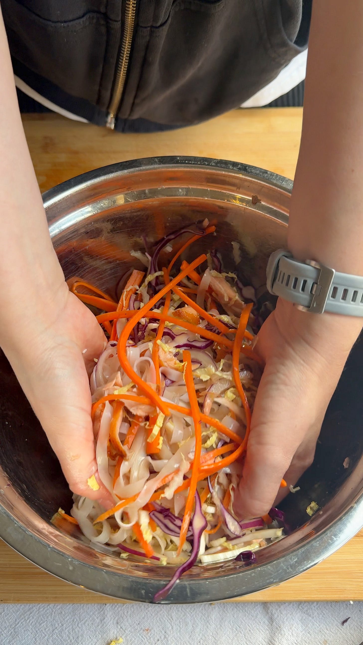 Chinese napa cabbage, red onion, carrot & red cabbage are the crunchy vegetables of choice for me today, but you can use anything that is nice eaten raw. Cucumber, peppers, any lettuce or cabbage & spring onions are all other things that may feature on any given week or day.