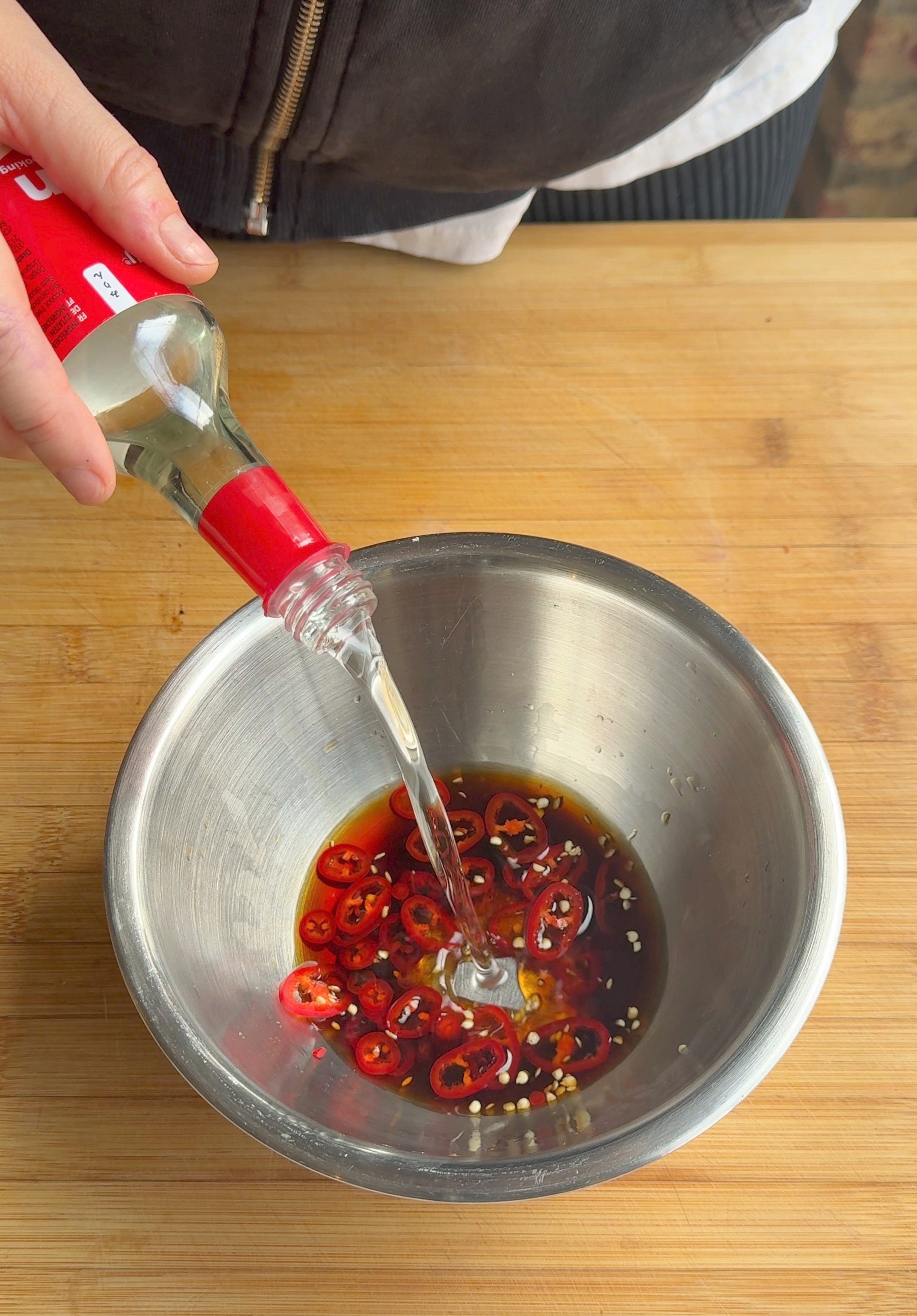 For the dressing, slice the chilli and add to a bowl with all other ingredients and mix together.